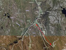 mellom 500-1000 m i luftlinje over til Grønåsen, syd i Hessdalen.