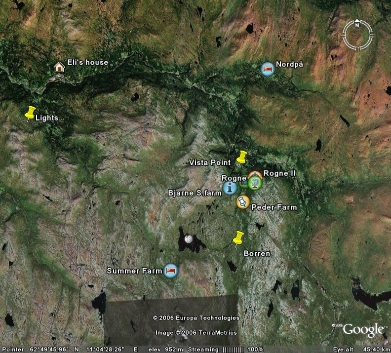 Kart. Forskjellige lokasjoner tegnet inn på et kart fra Google Earth