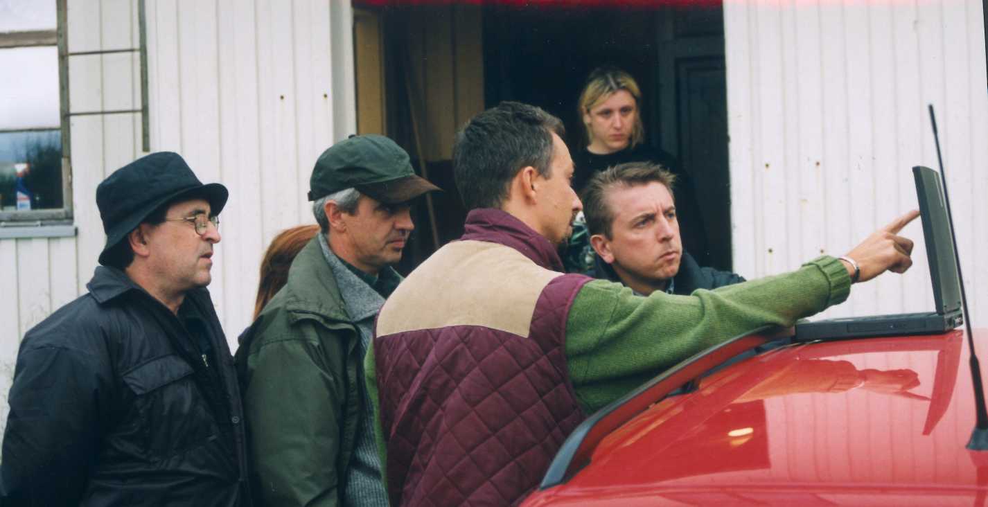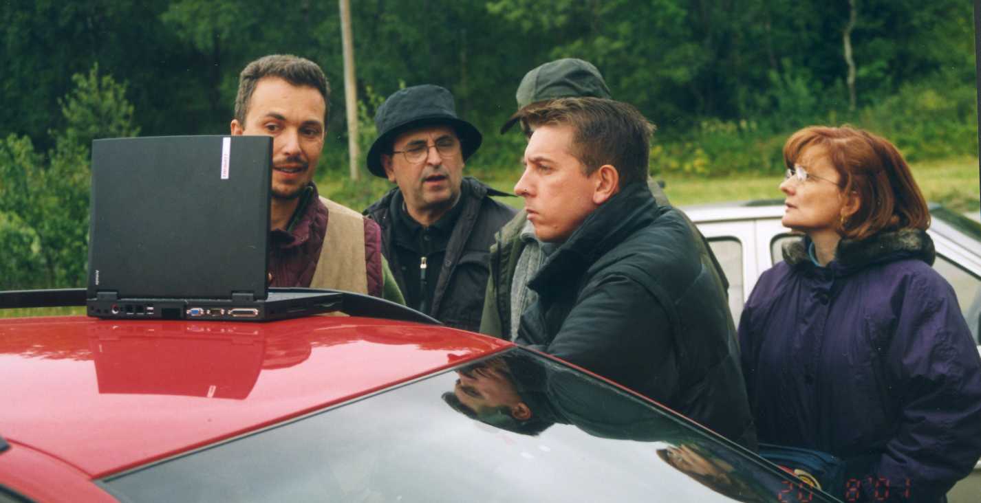 | Måleresultatene blir diskutert like etter ankomst fra målinger i felten. Jader Monari til venstre, Stelio Montebugnoli og Marco Poloni. Helt til høyre