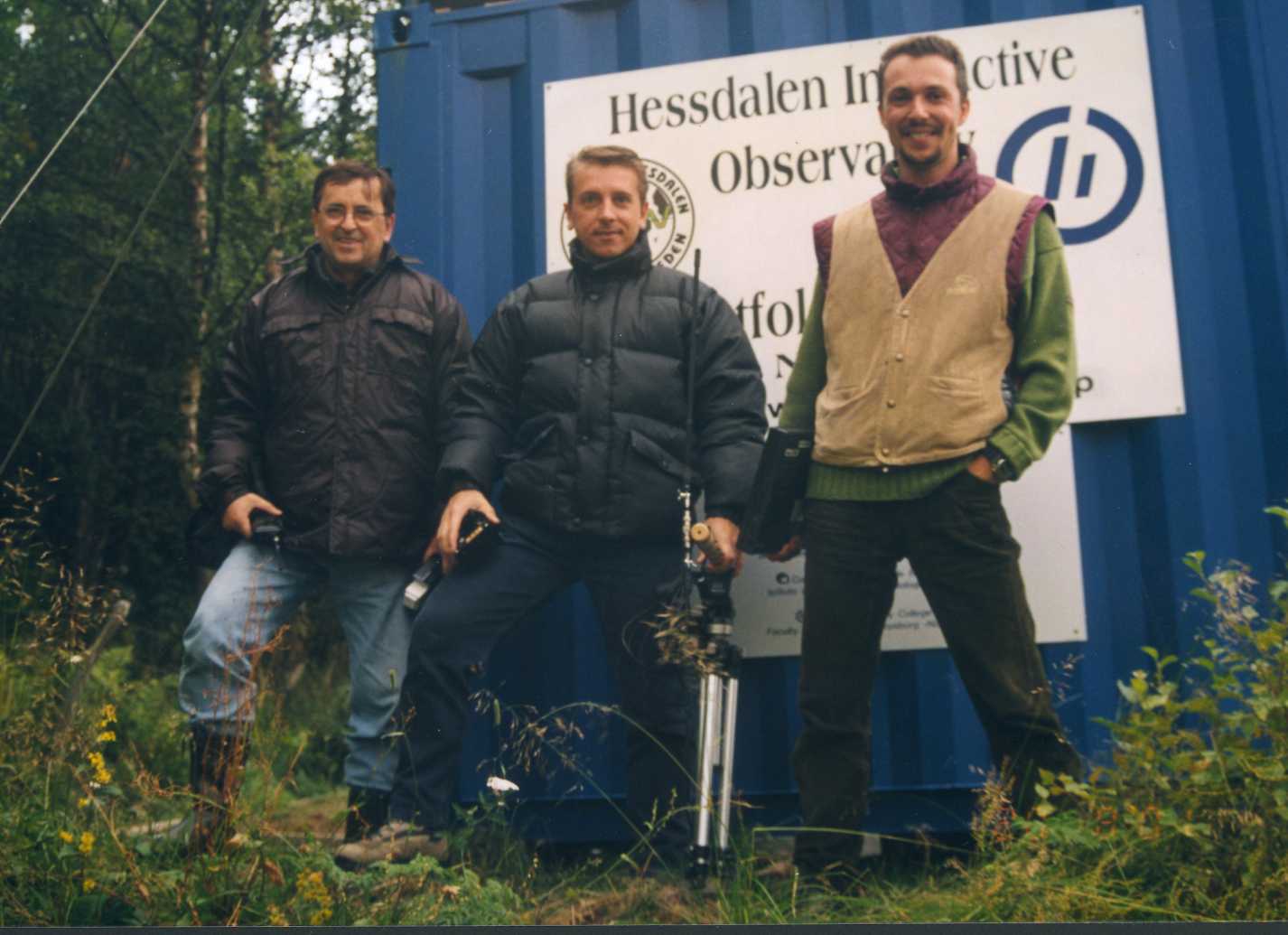 | Flavio Gori, Massimo Teodorani og Simona Righini utenfor målestasjonen i Hessdalen.
