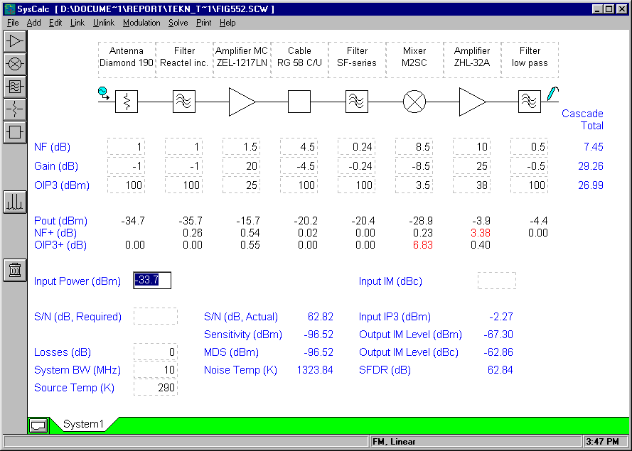 The graphic above illustrates the characteristics of the Reactel SN87-2 band pass filter and Mini-Circuits' ZEL-1217LN preamplifier serial connected. Notice the smooth theoretical-alike green curve, which is the gain. It indicates that the filter is of high quality. The red curve is the return loss (RL) of the system. As previously described, the area below 0 dB (blue arrow), indicates the RL quality. In this case, the area is quite large, thus the RL properties are good too. The marker is reading values at 1.403 GHz.